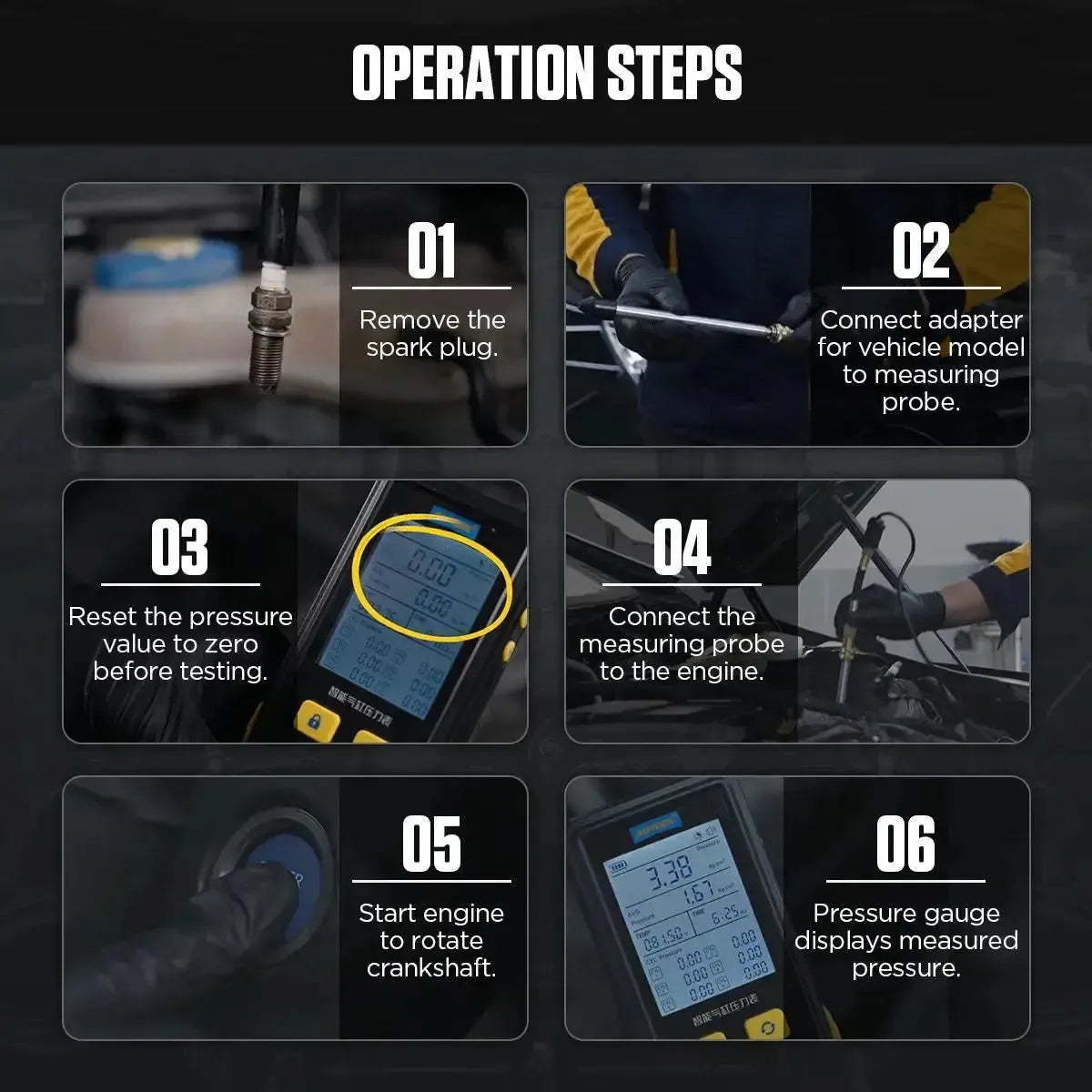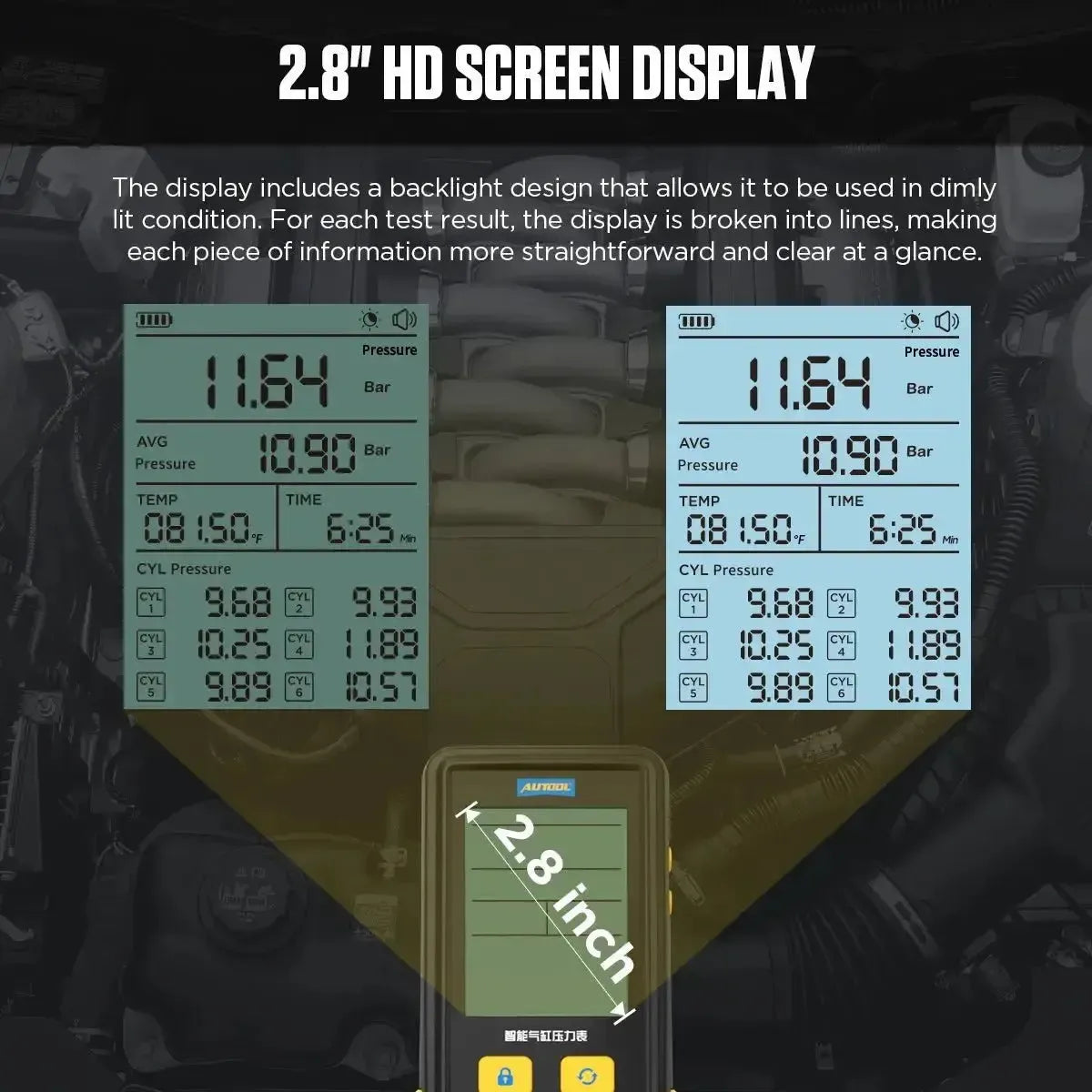 - Cyfrowy pomiar: Pokazuje ciśnienie w czasie rzeczywistym, średnie ciśnienie oraz indywidualne wartości ciśnienia dla każdego cylindra z rozdzielczością do dwóch miejsc po przecinku.