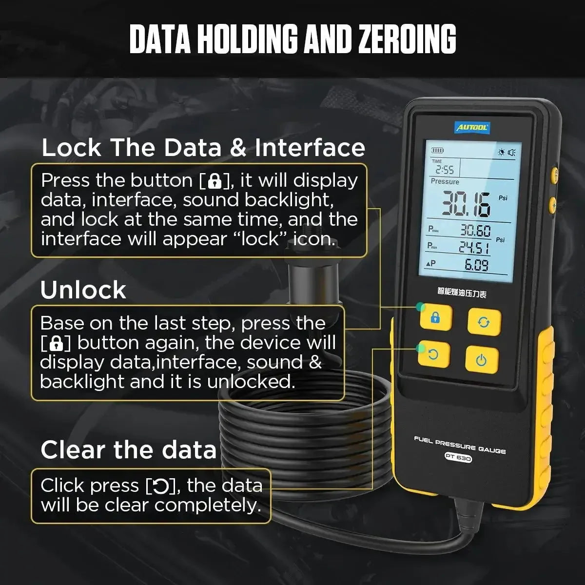 Autool PT630 to cyfrowy brandstofdruktester do precyzyjnego pomiaru ciśnienia w układach paliwowych pojazdów. Instrument wyposażony jest w duży 2,8-calowy ekran LCD z podświetleniem dla wyraźnego wyświetlania wyników pomiarów. Miernik ma zakres pomiarowy 0–29,4 bar, 0–426,6 psi oraz 0–30 kg/cm² i jest dostarczany z rozbudowanym zestawem adapterów, co czyni go kompatybilnym z szeroką gamą pojazdów.