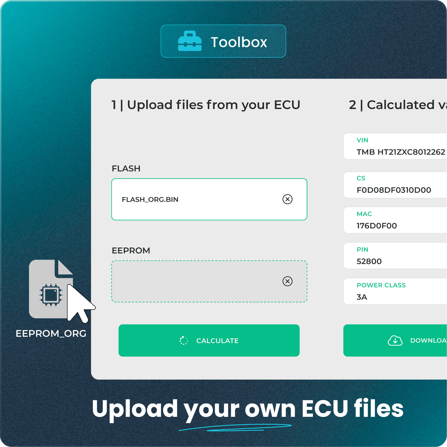 Załaduj własne oryginalne pliki ECU i odczytaj bezpośrednio ważne wartości, takie jak VIN, CS, MAC, [PIN], Power Class itp.