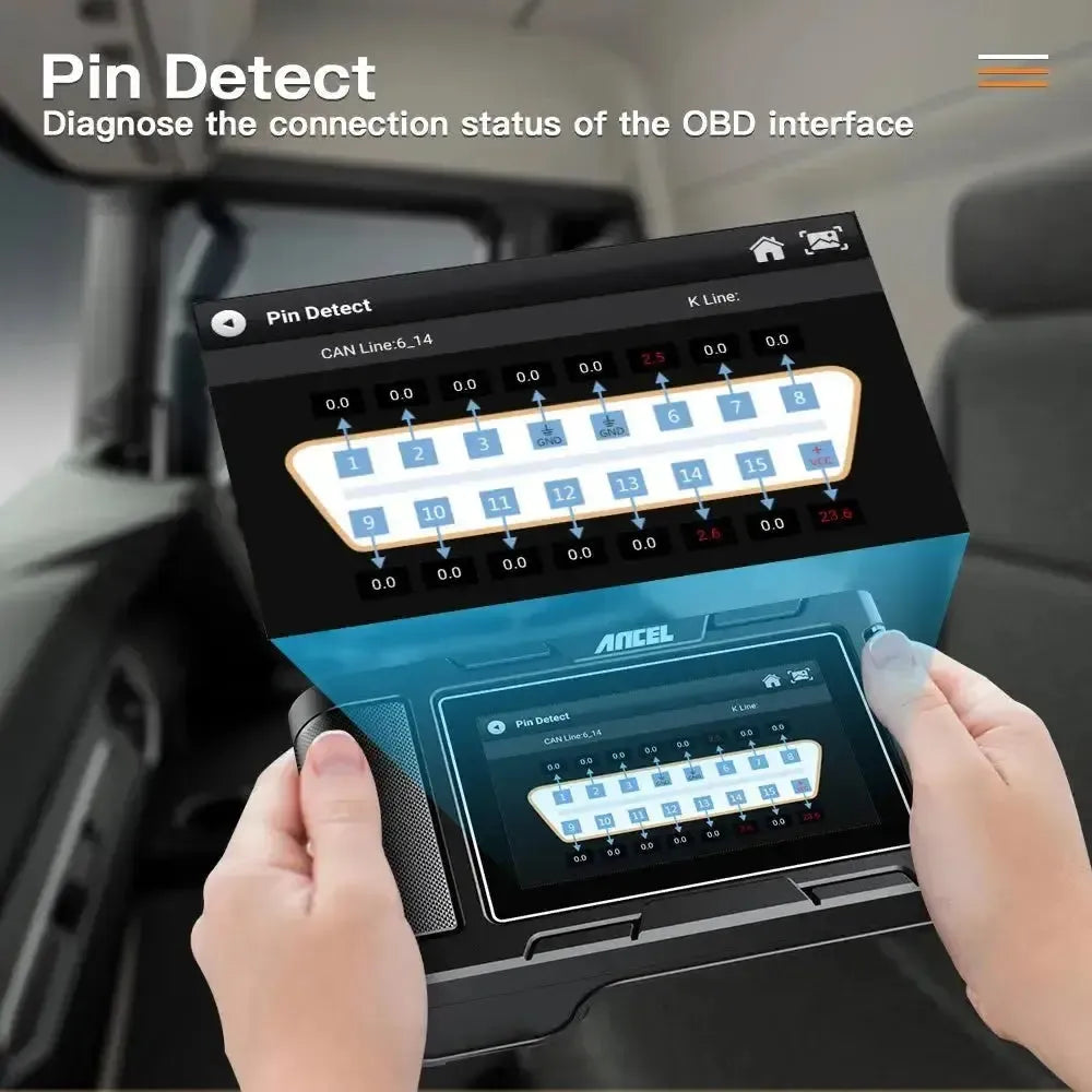 - Automatyczne wykrywanie pinów: Automatycznie mierzy i sprawdza napięcie zasilania na złączu OBD, w tym linie K i CAN, aby zweryfikować połączenia.