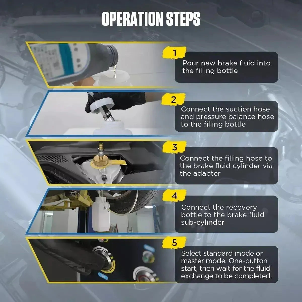 - Impulsowa wymiana: Funkcja pulsującego ciśnienia pomaga skutecznie usuwać pęcherzyki powietrza z przewodów hamulcowych.