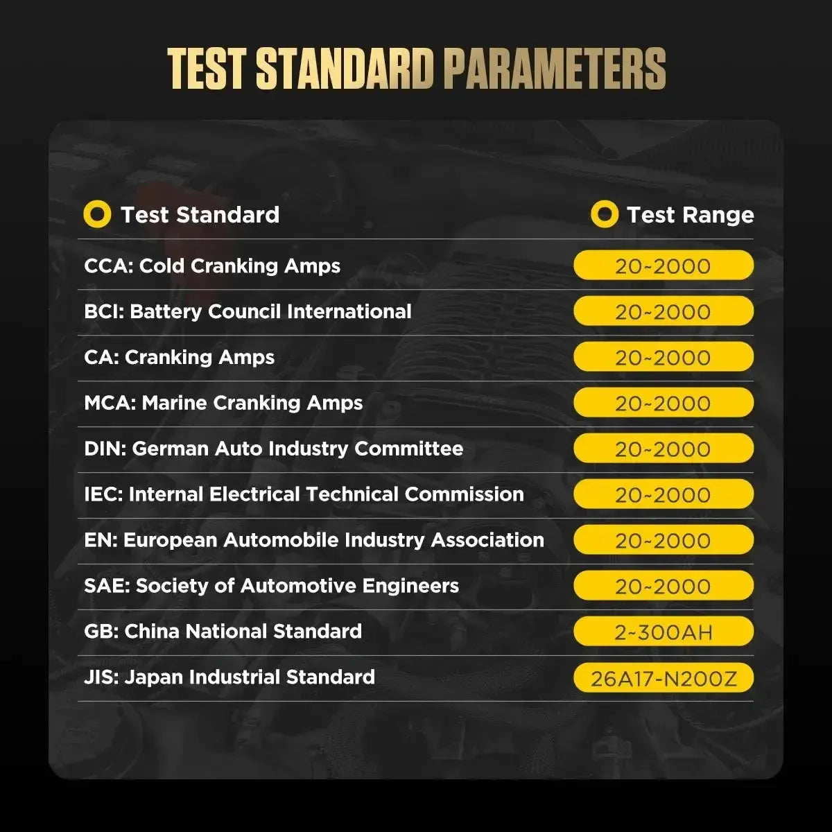 Tester obsługuje pomiary zgodnie z różnymi międzynarodowymi normami, co zapewnia dokładne wyniki oparte na specyfikacjach producenta akumulatora.