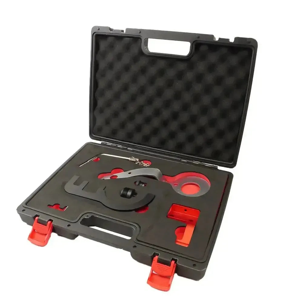 Ten 7-częściowy zestaw zawiera elementy takie jak narzędzie do blokowania wałka rozrządu, różne narzędzia do blokowania wału korbowego oraz ściągacz do koła zębatego pompy wysokiego ciśnienia. Komponenty są zaprojektowane do zablokowania silnika w górnym martwym punkcie (GMP), co jest niezbędne do prawidłowej wymiany łańcucha rozrządu i regulacji czasu pracy silnika.